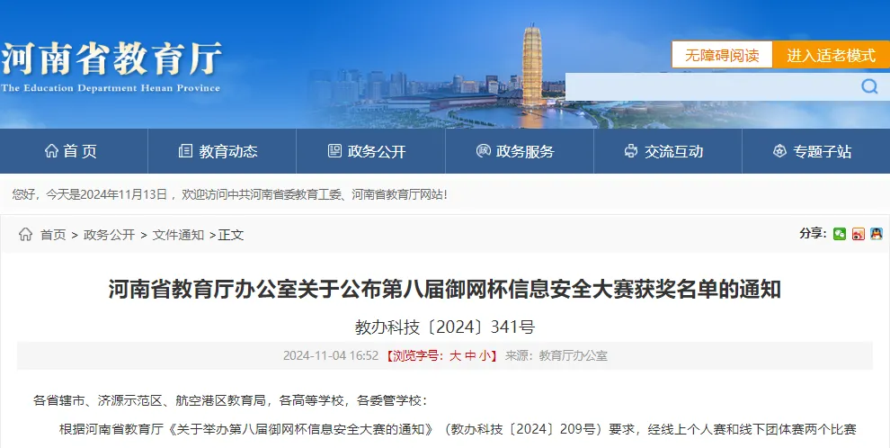 11月4日,河南省教育厅发布《关于公布第八届御网杯信息安全大赛获奖名单的通知》(教办科技〔2024〕341号)。根据河南省教育厅《关于举办第八届御网杯信息安全大赛的通知》(教办科技〔2024〕209号)要求,经线上个人赛和线下团体赛两个比赛环节,44118太阳成城集团代表队,凭借精彩的发挥,在各大高校参赛选手中脱颖而出,喜获9个奖项:线上个人赛二等奖6项、三等奖1项,线下团体赛一等奖2项。